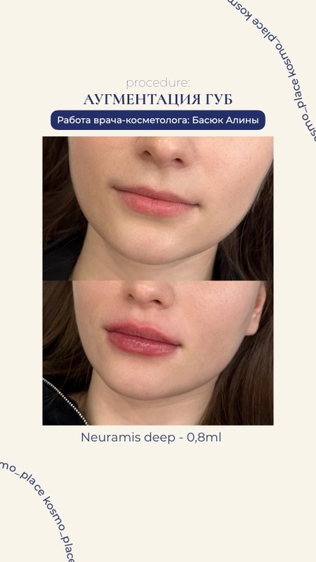 Общее впечатление от Kosmo Place осталось хорошее. В клинике комфортная обстановка, понравилось общение с персоналом - приятно провела время, пообщалась с косметологом Алиной. От процедуры я получила именно тот результат, который и хотела: красивые губы и отсутствие морщин. Косметолога клиники выбрала по рекомендации подруги, которая сказала, что Kosmo Place - клёвое место.